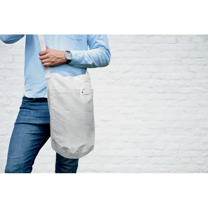 Холщовая сумка на длинном регулируемом плечевом ремне с большим передним карманом на застежке. Есть внутренний карман. 270 гр/м².