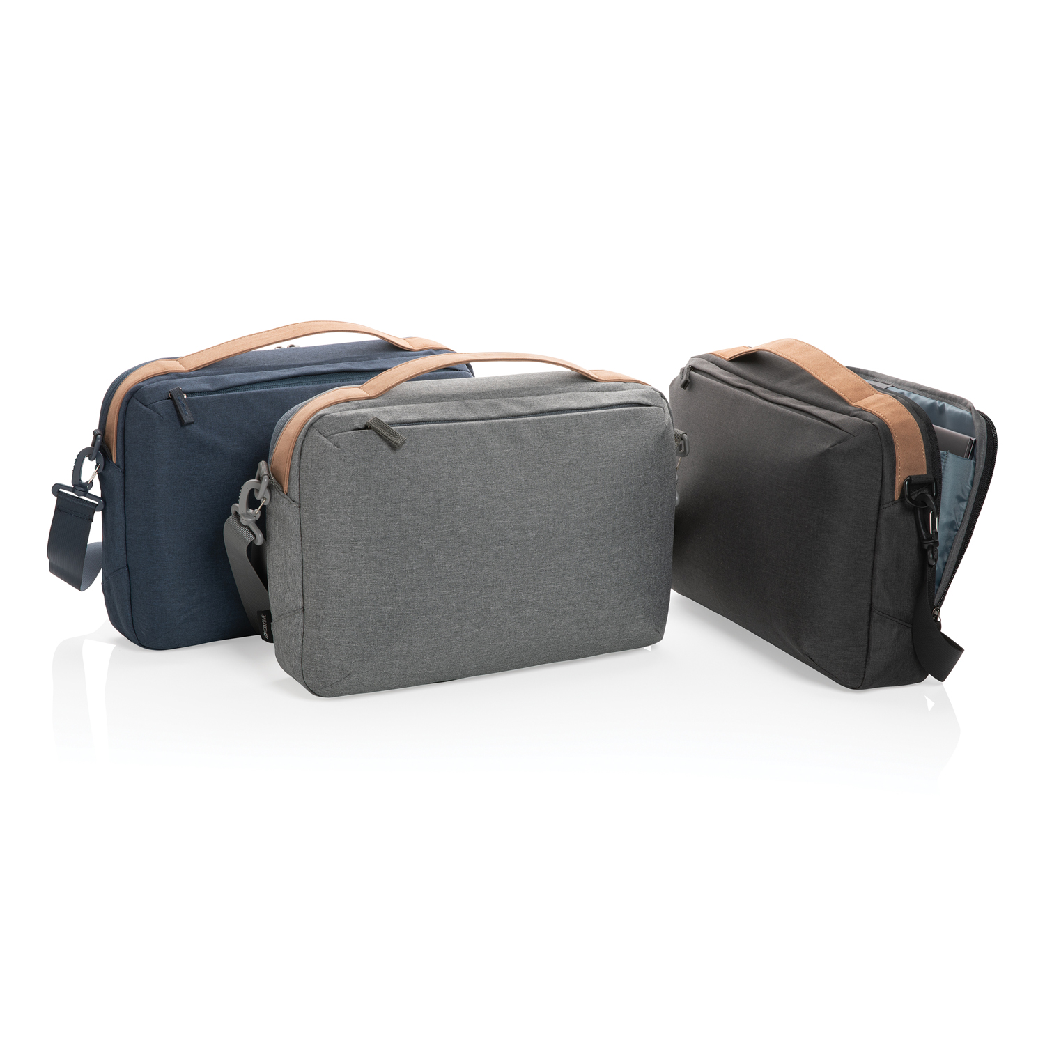 Стильный аксессуар с минималистичным дизайном прекрасно подойдет для ежедневного использования. В основном отделении есть отсек для ноутбука диагональю 15.6" и два сетчатых кармана. Спереди расположен дополнительный карман на молнии. Надежная ручка из полиуретана. И ткань сумки, и подкладка выполнены из переработанного полиэстера с добавлением индикатора AWARE™. Наличие индикатора гарантирует, что в изделии использованы настоящие переработанные материалы. При производстве каждой сумки мы сэкономили 5,2 л воды и повторно использовали 8,75 пластиковых бутылок объемом 0,5 л. 2% от продаж коллекции Impact будет перечислено в поддержку всемирной благотворительной организации Water.org.