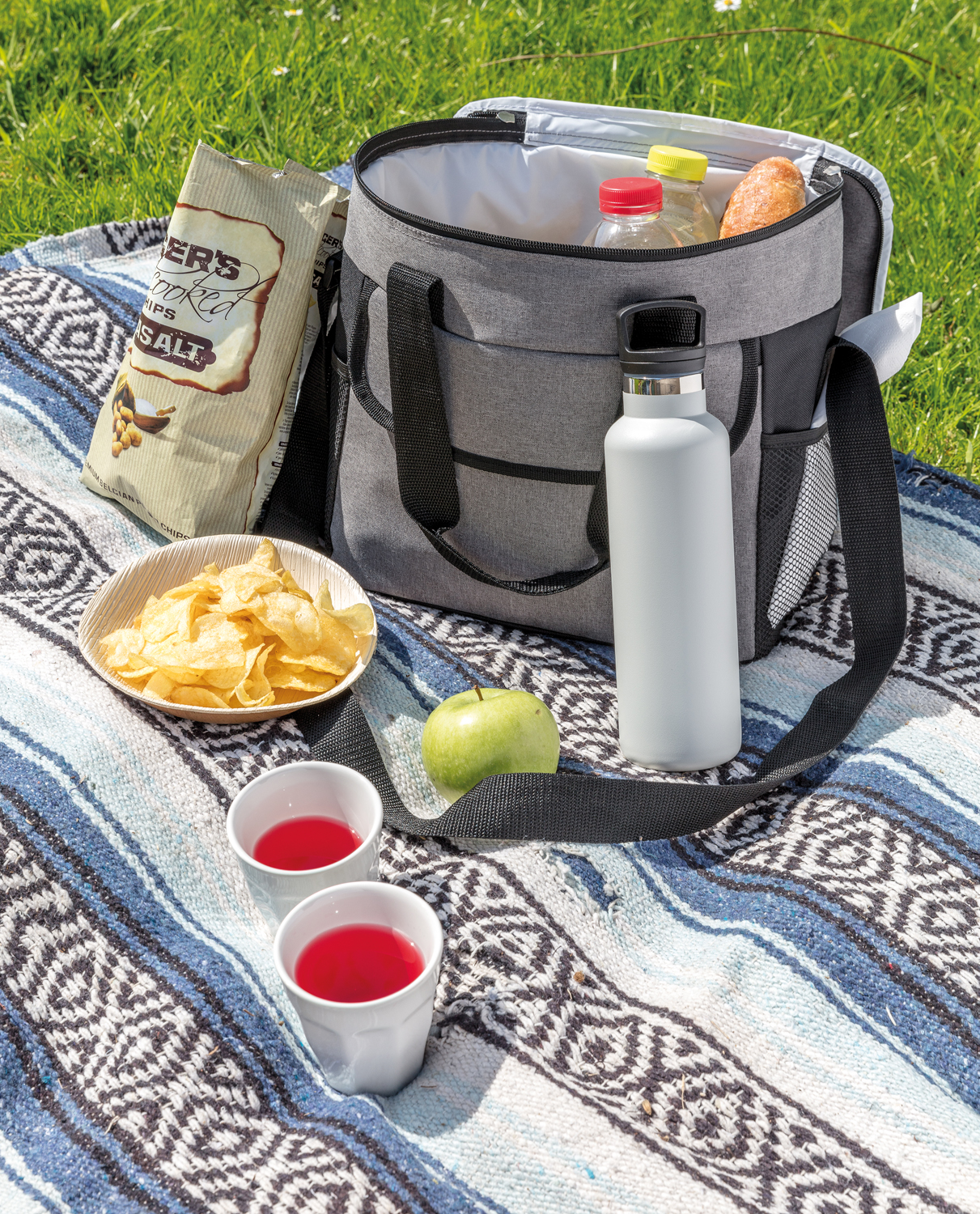 Объемная двухцветная сумка-холодильник из полиэстера 600D может вмещать до 20 банок. 1 передний карман и 2 боковых кармана-сетки.