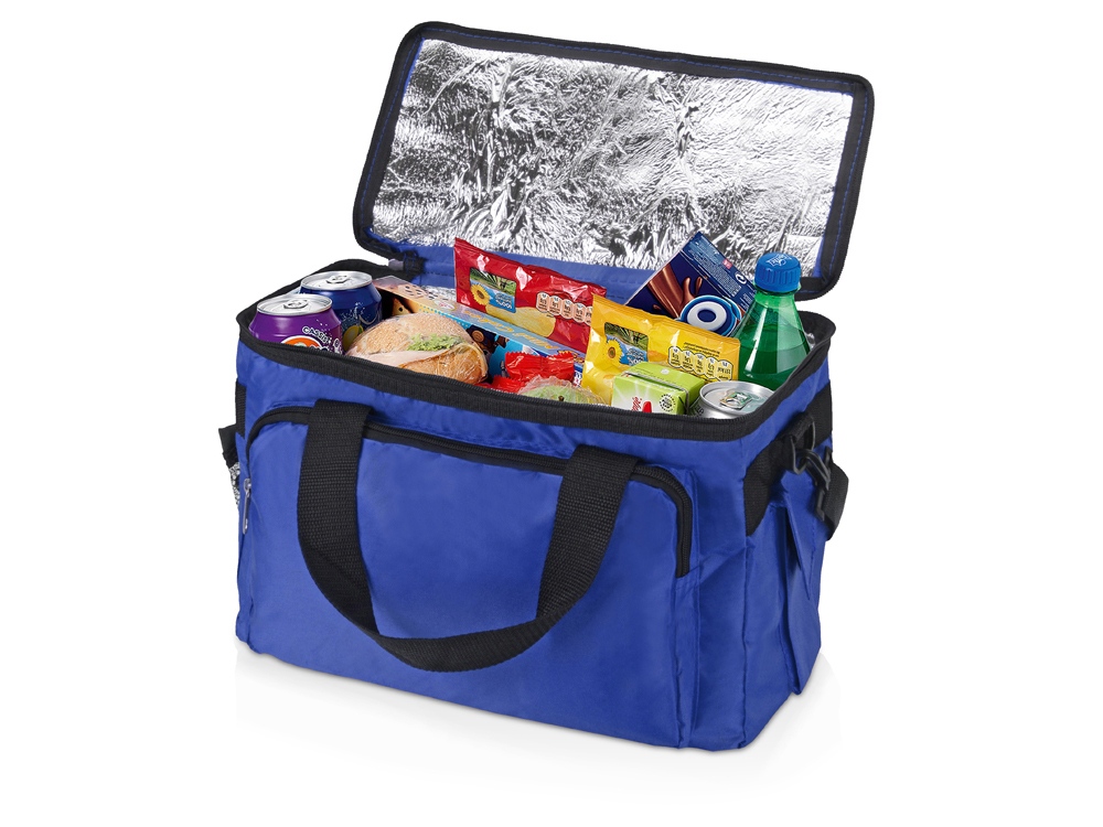 Вместительная сумка-холодильник (объем – 15 л.) Камайоре прекрасно подойдет не только для индивидуальных пикников, но даже и для доставки горячих продуктов (пиццы, например). С боков 2 кармана – один сетчатый с регулируемой затяжкой для бутылки. Другой для приборов, салфеток или других мелочей закрывается на липучку. Наружный слой сделан из полиэстера, на него может быть нанесена персонализация: имя владельца или логотип компании.