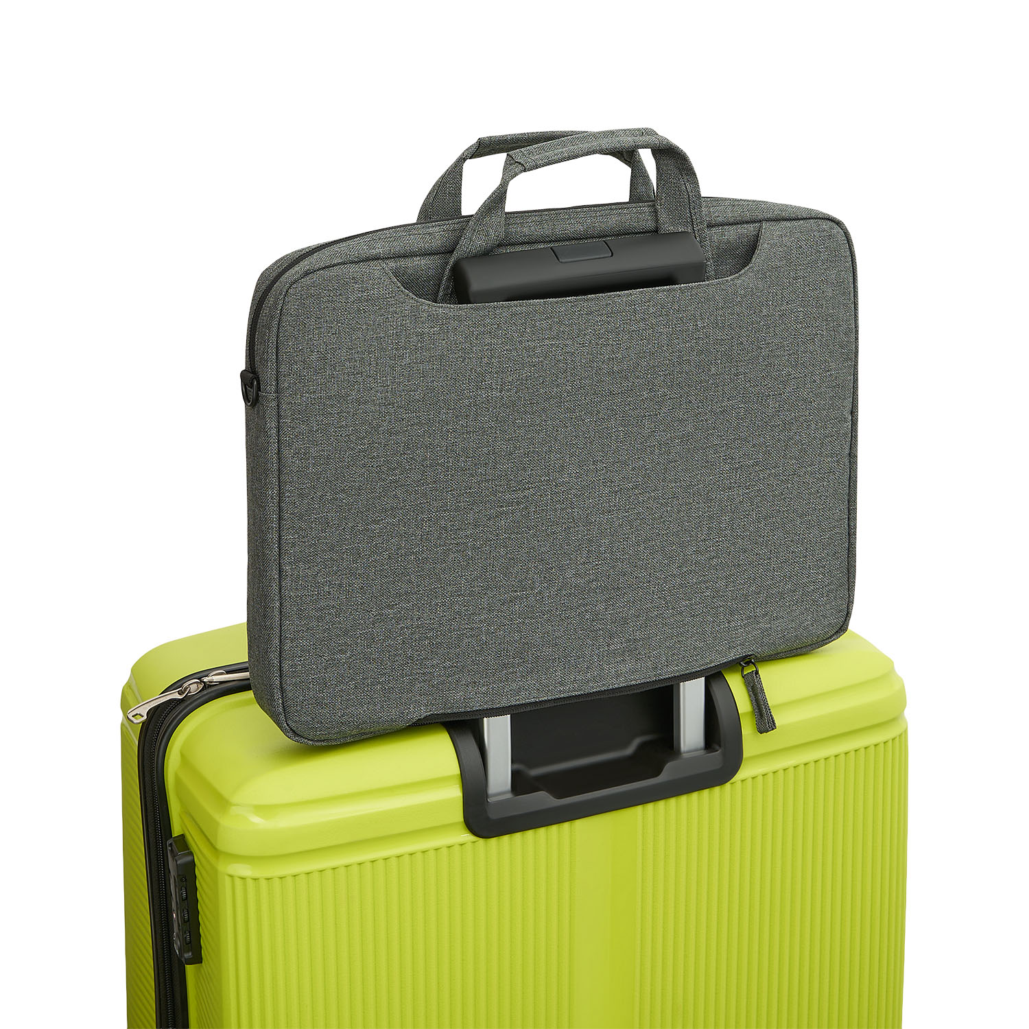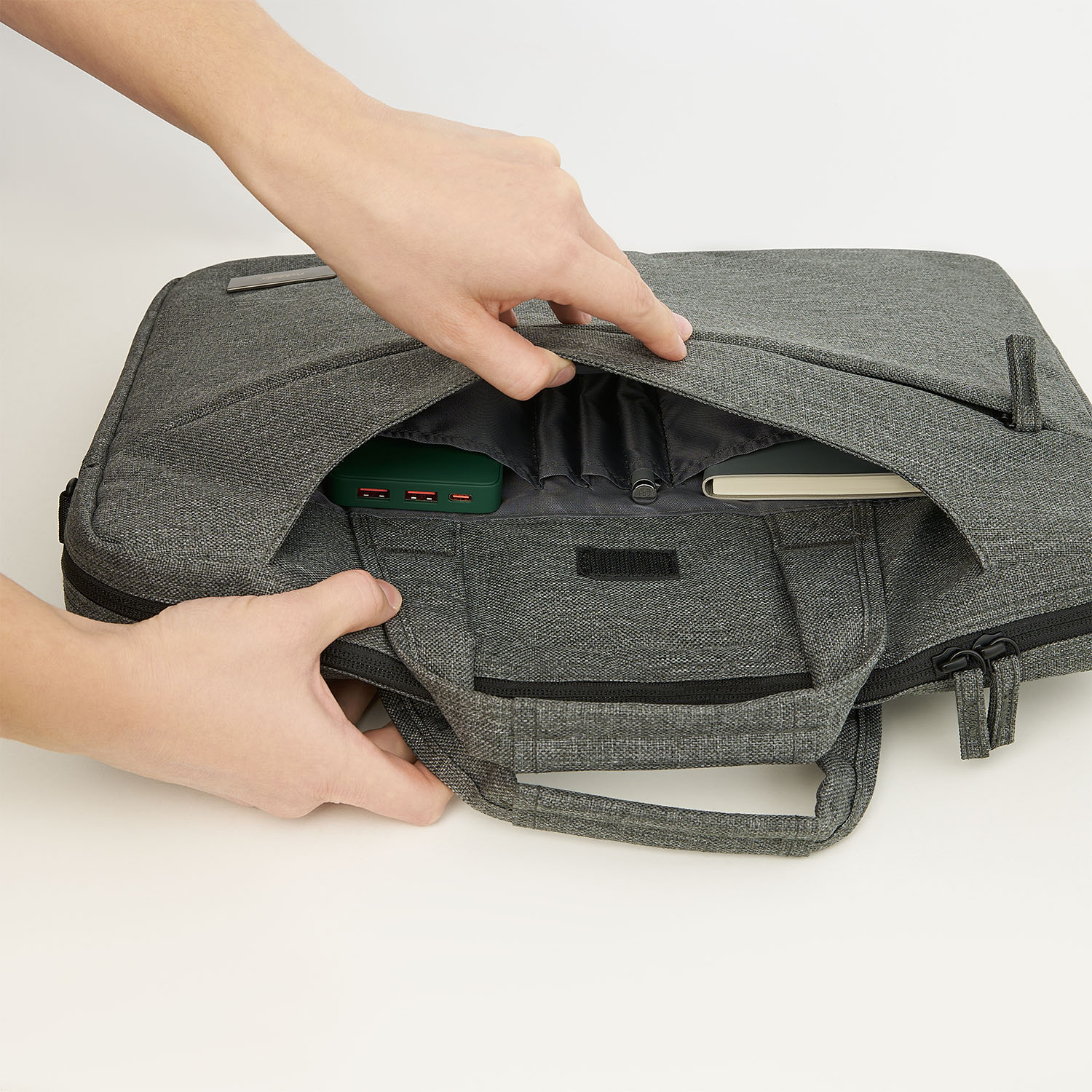 С внешней внутренней стороны общее отделение на липучке, которое можно использовать как дополнительное отделение для бумаг, либо открыть молнию внизу и одевать на выдвижную ручку вашего чемодана.