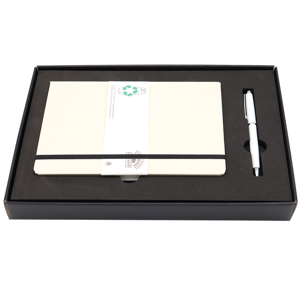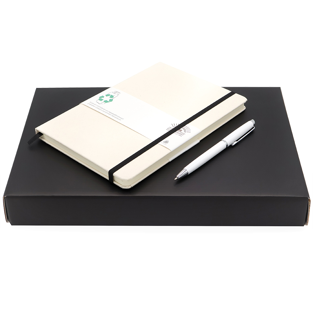 "Writer" — Подарочный набор в элегантной цветной коробке черного цвета с конструкцией крышка-дно. Внутри расположен ложемент, специально разработанный для надежного и аккуратного размещения всех элементов набора. В набор входят стильный ежедневник с плотной обложкой (арт. 51013.02) и изысканная ручка (арт.1059.01), идеально дополняющая комплект. Такой набор станет отличным подарком для деловых людей и ценителей качественных канцелярских принадлежностей, сочетая в себе утонченность, практичность и презентабельность.