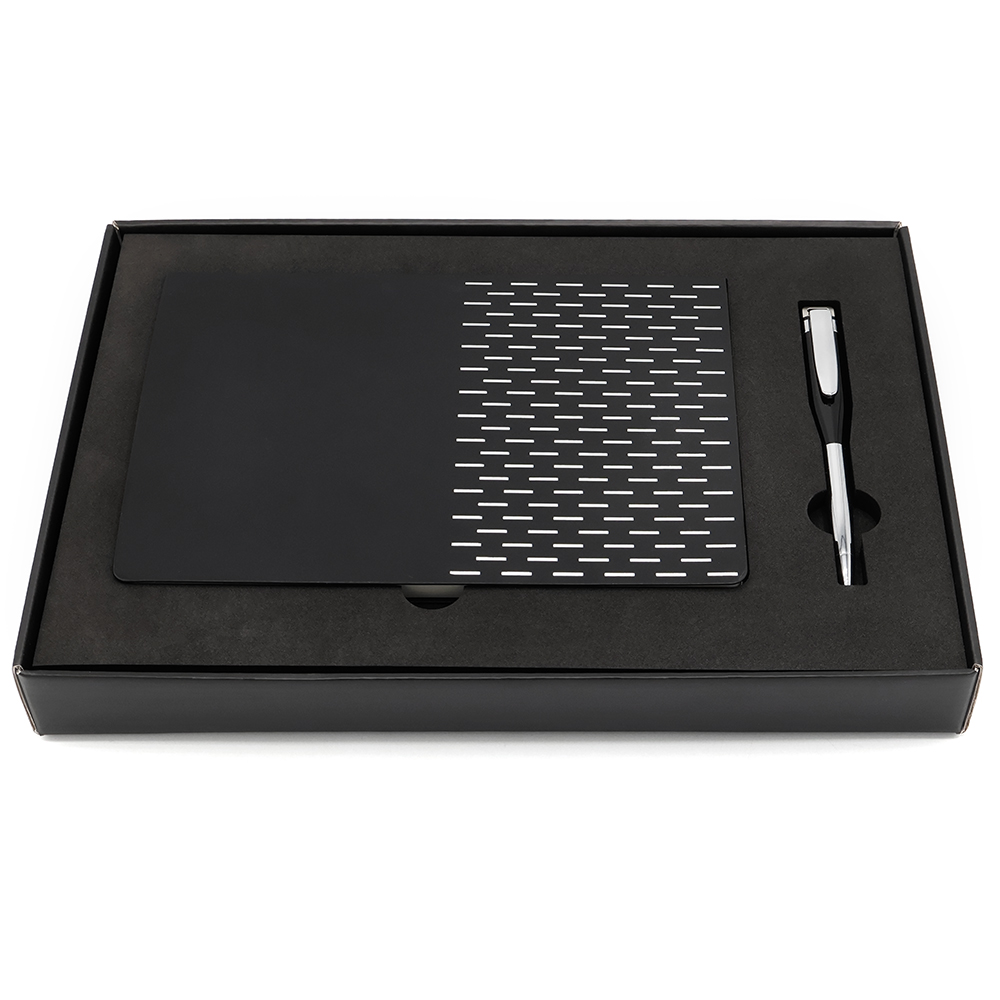 Подарочный набор в стильной цветной картонной коробке черного цвета (крышкой-дно). Внутри на аккуратном ложементе располагаются ежедневник А5 и элегантная металлическая ручка - флешка емкостью 64 ГБ.
