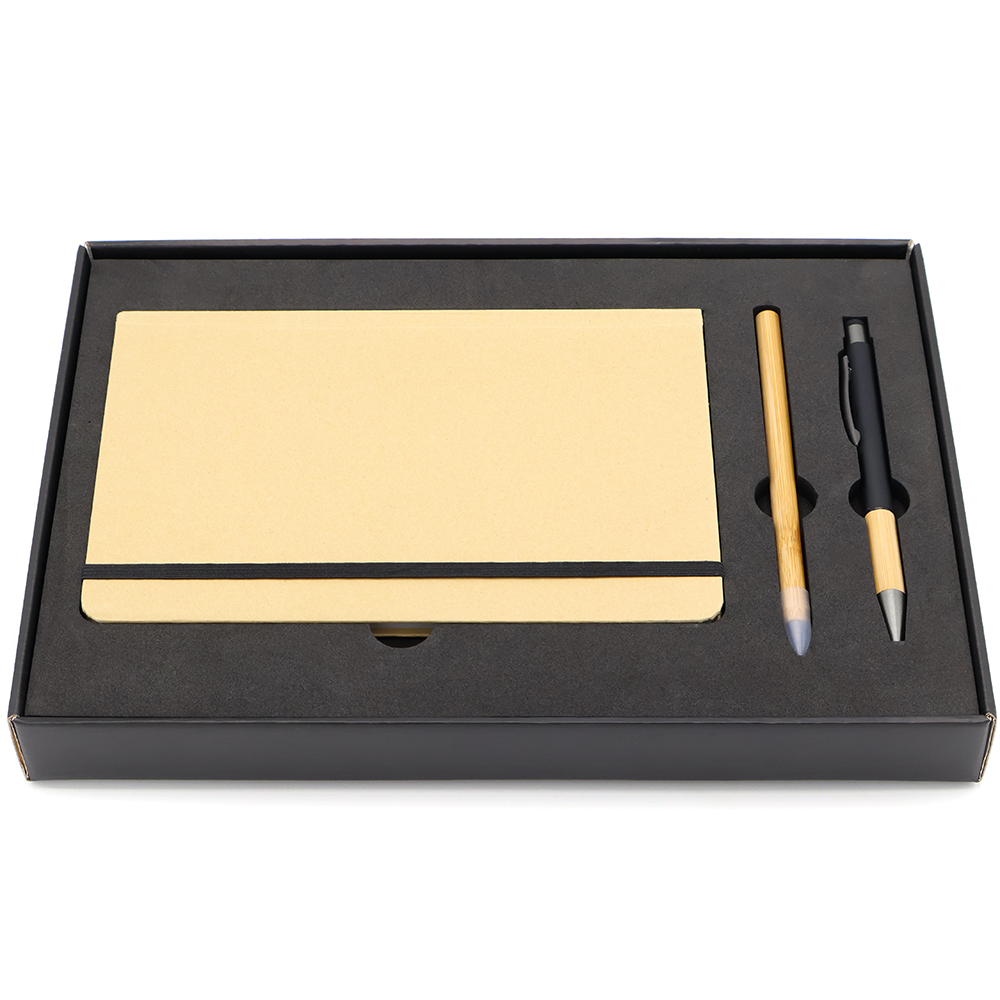 Подарочный набор в стильной цветной картонной коробке черного цвета (крышкой-дно). Внутри на аккуратном ложементе располагаются блокнот, ручка c корпусом из бамбука, и вечный карандаш.