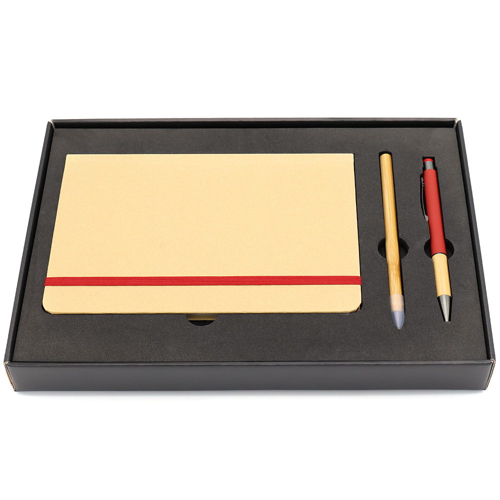 Подарочный набор в стильной цветной картонной коробке черного цвета (крышкой-дно). Внутри на аккуратном ложементе располагаются блокнот, ручка c корпусом из бамбука, и вечный карандаш.