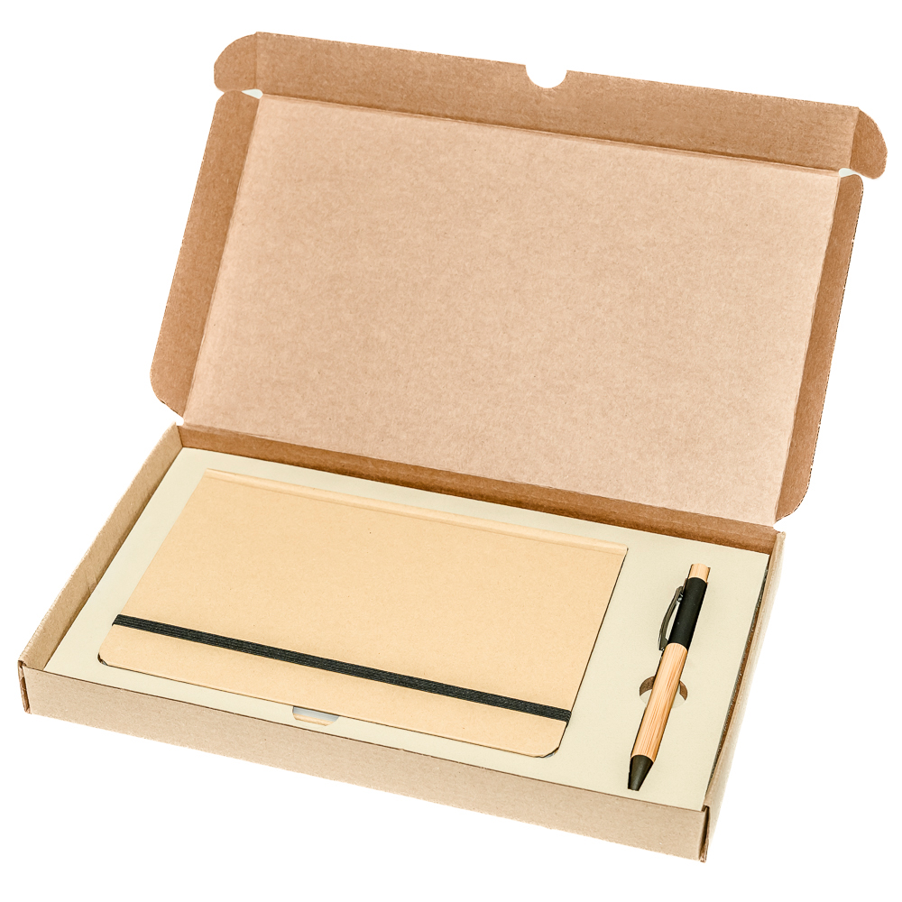 Подарочный набор в стильной картонной коробке бежевого цвета (крышкой-дно). Внутри на аккуратном ложементе располагаются блокнот в твердом переплете и ручка из бамбука.
