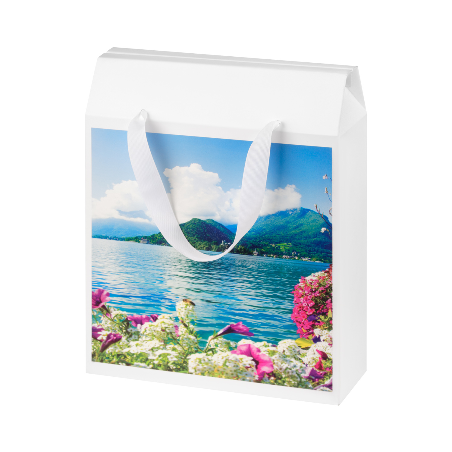 Универсальный пакет – коробка выполнен в белом цвете с ручками из рапсовой ленты. Вместительный и изящный, он станет хорошим решением упаковки подарка.