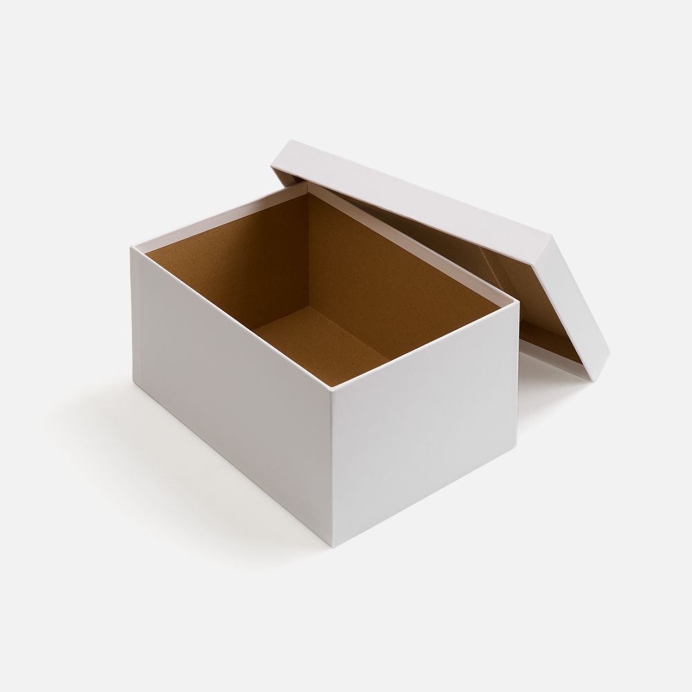 Коробка из переплетного картона, кашированного белой дизайнерской бумагой.