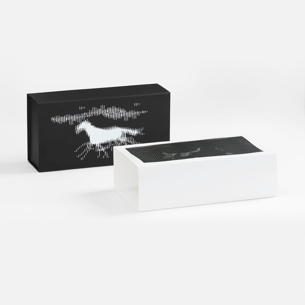 «Динамика успеха» — интерактивная упаковка, дизайн которой говорит сам за себя. Она как бы напоминает: настоящий успех начинается с первого шага — и продолжается в каждом следующем. При открытии коробки изображение лошади словно оживает: стоит отодвинуть шубер — и конь срывается в бег.