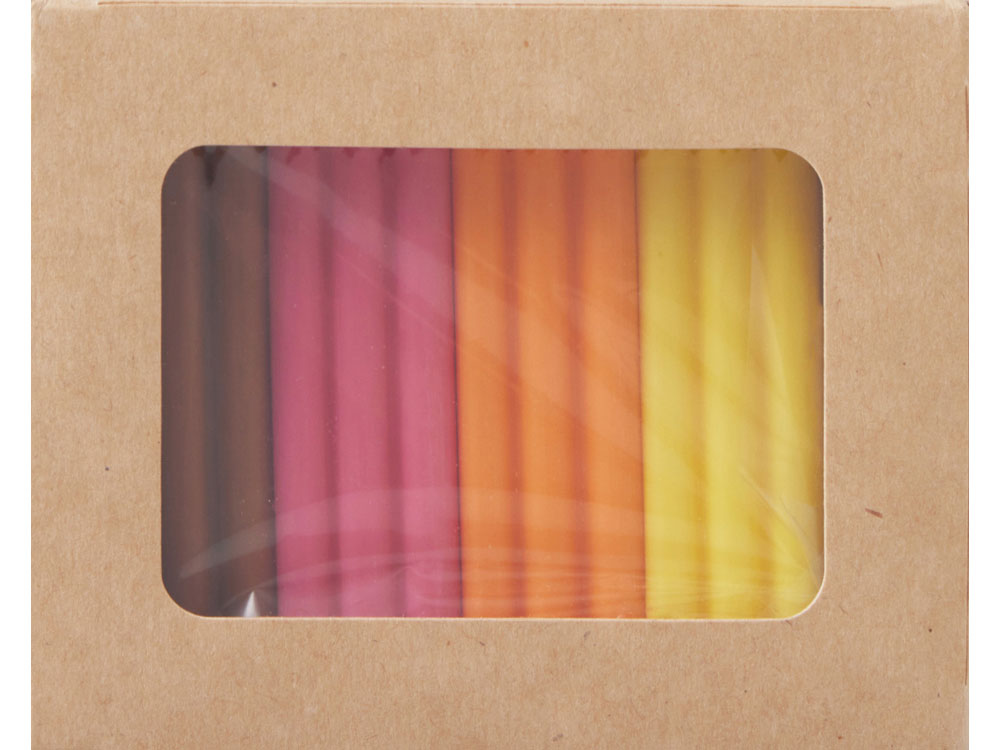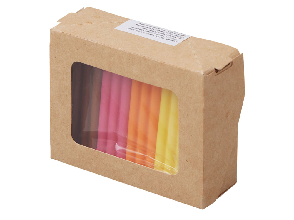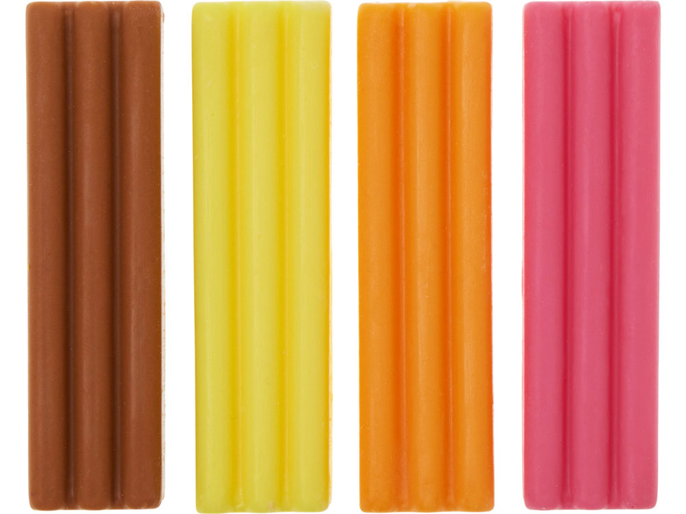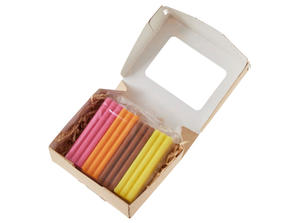 Яркие и необычные конфеты в форме, напоминающей пластилин, создают праздничное настроение и радуют глаз. Изготовлены из качественных ингредиентов. В каждом наборе — 4 ярких вкуса: банан, апельсин, малина и солёная карамель!
