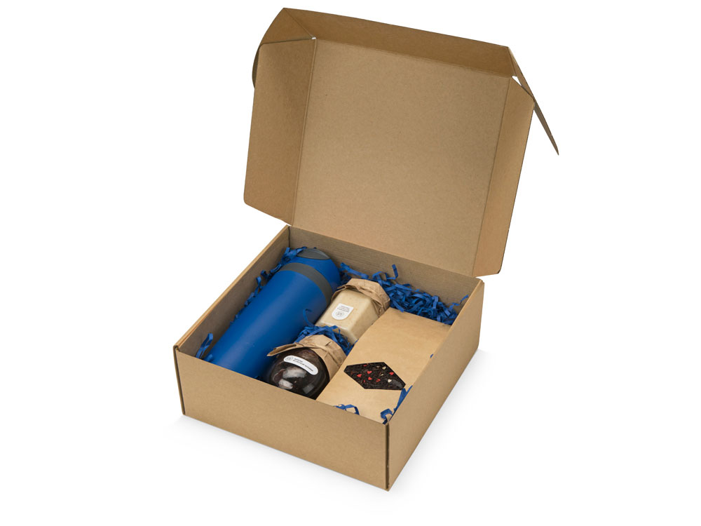 Набор состоит из термокружки, баночки крем-мёда с кокосом и миндалём, варенья из сосновых шишек, чёрного чая. Набор упакован в крафтовую картонную коробку с бумажным наполнителем.
