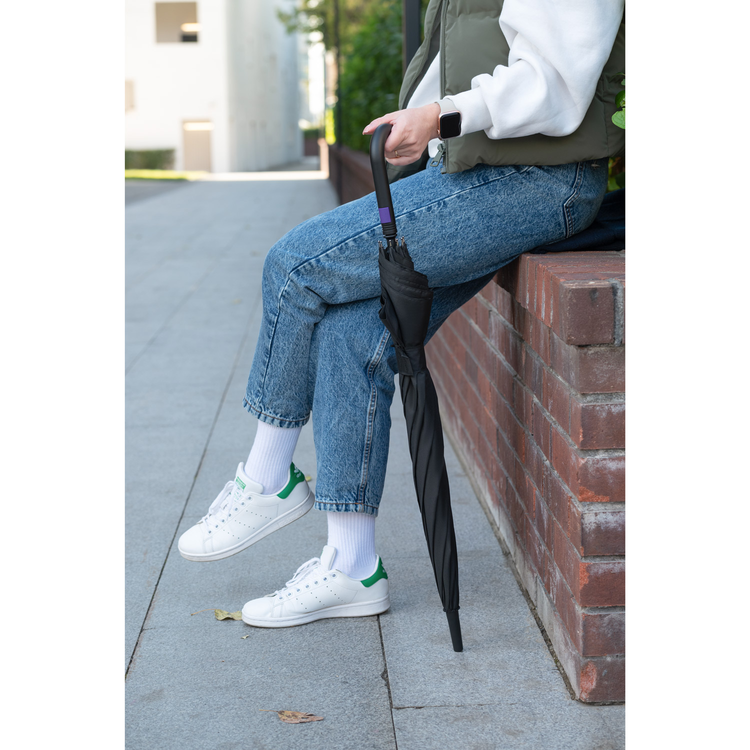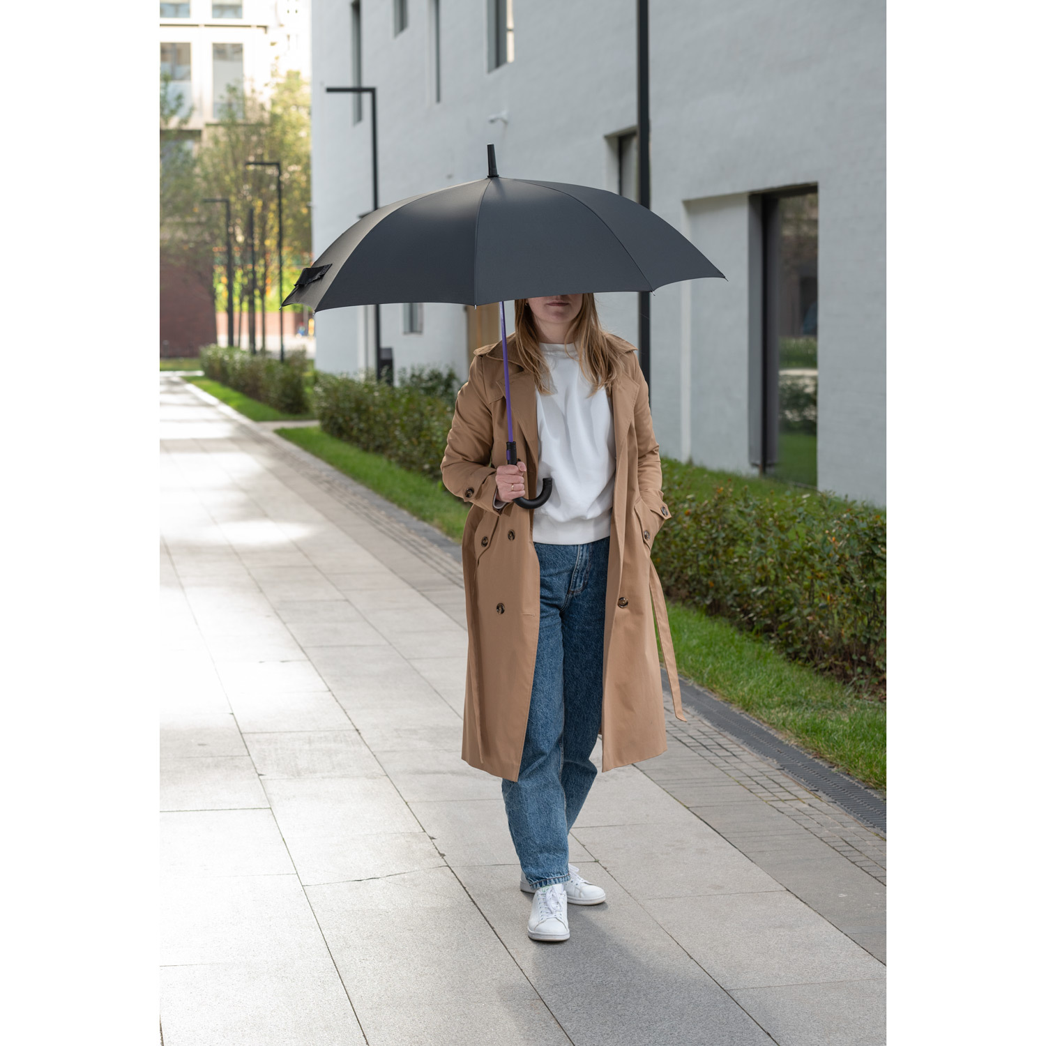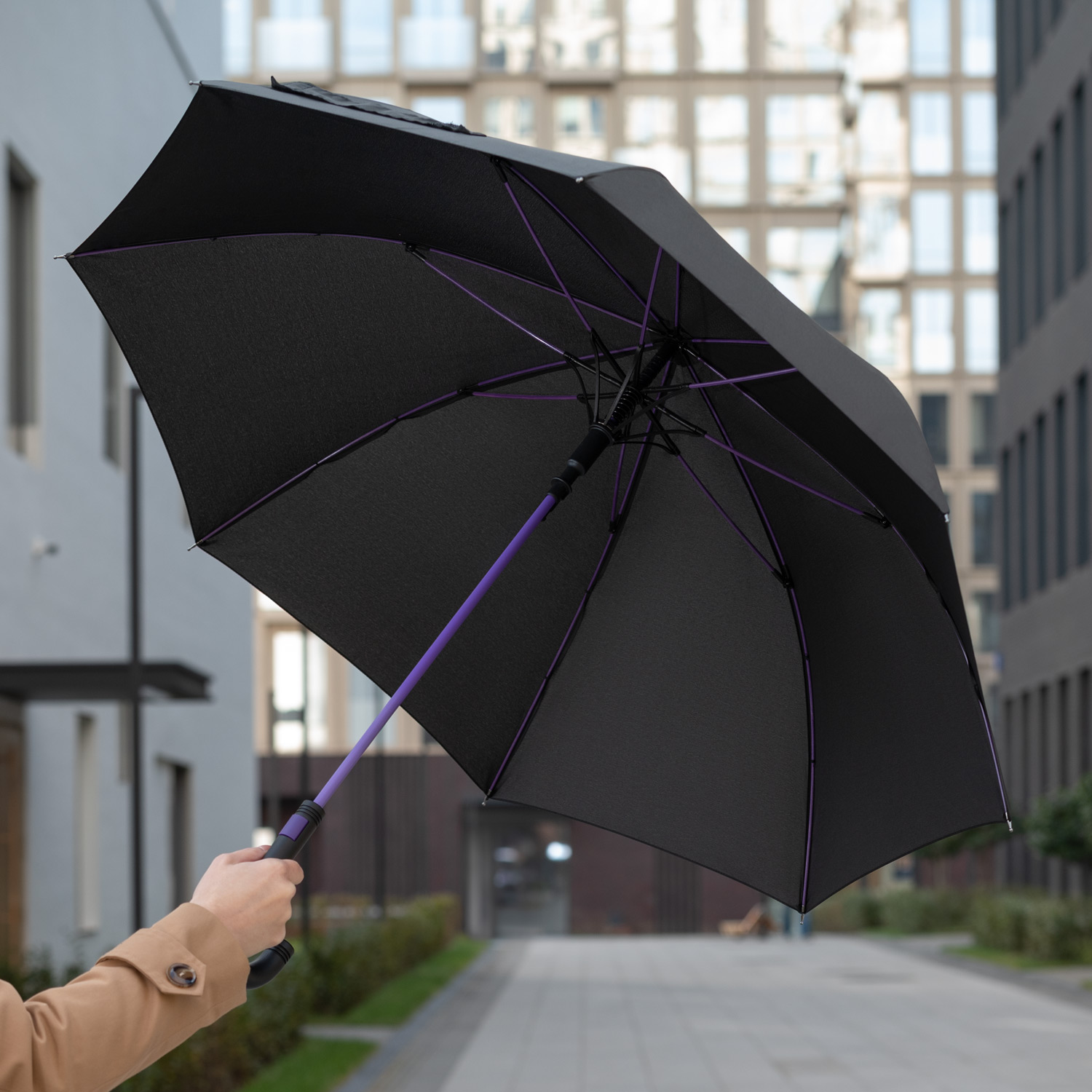 Полуавтоматический зонт быстро раскрывается при нажатии на кнопку. Контрастные цветные спицы окрашены в тон трости и кнопки на ручке. Зонт оснащен гибкими спицами с конструкцией антиветер, которая защищает зонт от поломок при резких порывах ветра. PU-покрытие на ручке зонта обеспечивает комфортное и долговечное использование аксессуара: оно устойчиво к истиранию, не скользит в руке и не становится липким.